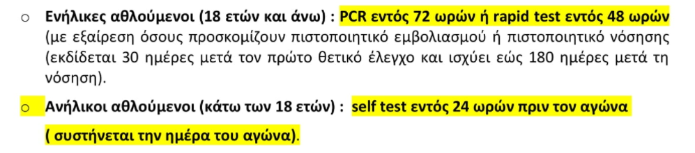 – Αθλητές ως και 17 ετών: PCR ή rapid test 48h ή self test παρουσία του υπεύθυνου covid της ομάδας την ημέρα του αγώνα